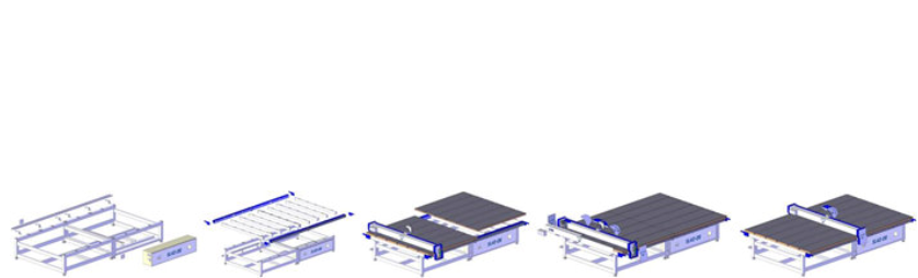 CONCEPT OF PRODUCTION AND ASSEMBLY We have developed a new concept of building machines, every single part of the machine is designed with 3D CAD technology, processed by CAD CAM and machined with a CNC Working Center.This innovative system is the only one that can guarantee perfect uniformity and constant quality of all the machines that are being built and every single part of the machine can be easy replaced if needed, even the felt table surface.The machines assembly is divided into specific steps, controlled by a management software, which supports and guides our technicians during the various stages of assembly, the following pictures is an example of the assembly steps: